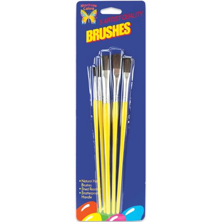 Set includes 5 artist quality brushes. Natural hair brushes, shed resistant, and shatterproof handle. Handles are yellow. Includes 5 different sizes. Conforms to ASTM D 4236.