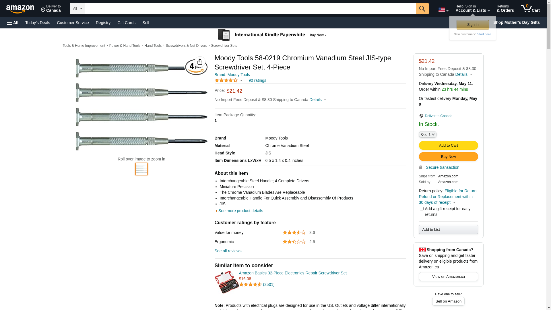 Moody Tools 58-0219 Chromium Vanadium Steel JIS-type Screwdriver Set, 4-Piece, Silver