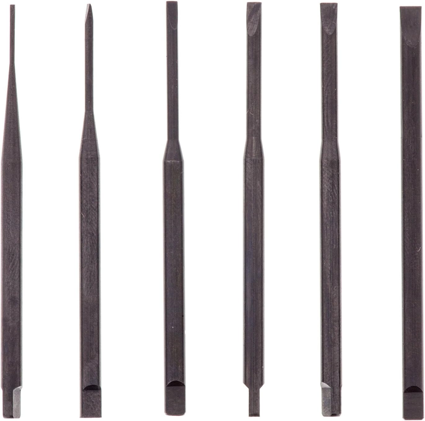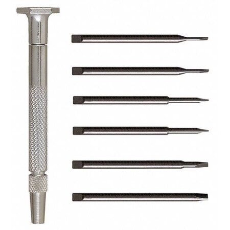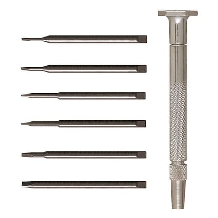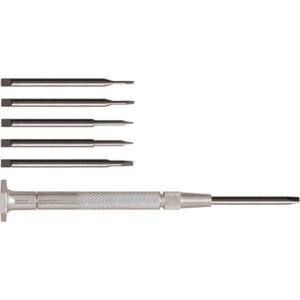 | Feature | <table class="spectable" width="100%"> <tr> <td>Overall Length:</td> <td>2.7"</td> </tr> <tr> <td>Drive:</td> <td>Slotted</td> </tr> <tr> <td>Drive Size:</td> <td>0.025, 0.040, 0.055, 0.070, 0.080, 0.100 (Slotted)"</td> </tr> <tr> <td>Includes:</td> <td>(6) Slotted Blades, (1) Jewelers Handle, (1) Vinyl Pouch</td> </tr> <tr> <td>Number of Pieces:</td> <td>7</td> </tr> </table> |