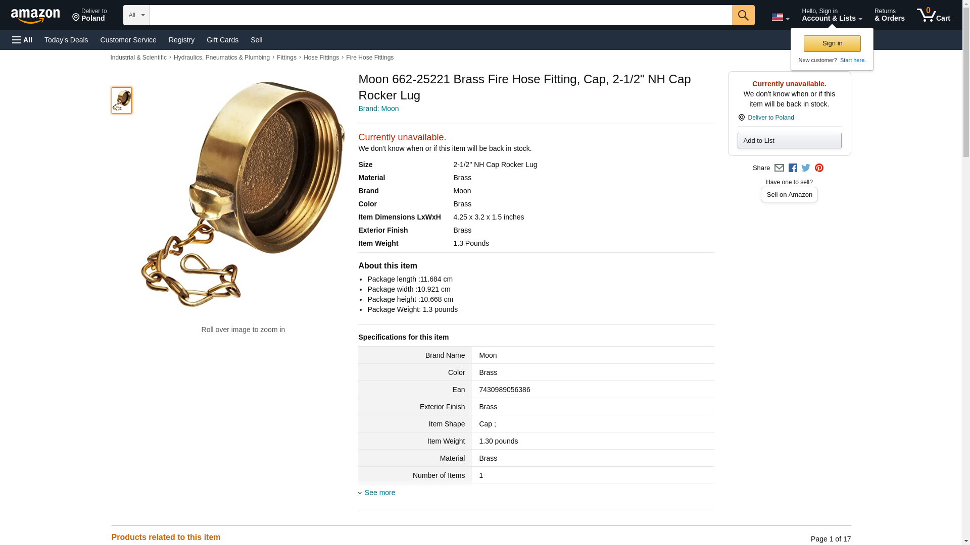 Moon 662-25221 Brass Fire Hose Fitting, Cap, 2-1/2" NH Cap Rocker Lug