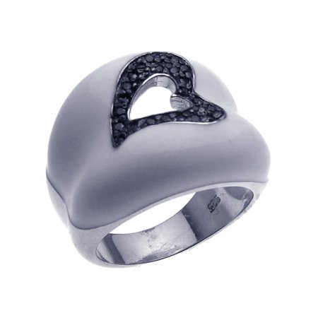 Sterling Silver Rhodium & Black Rhodium Plated White Enamel Pave Set Black CZ Heart Ring (Moon Collection)