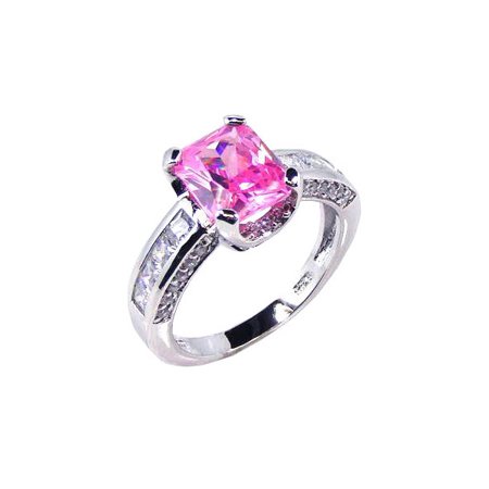 Sterling Silver Rhodium Plated Pink Sqaure & Clear CZ Ring (Moon Collection)