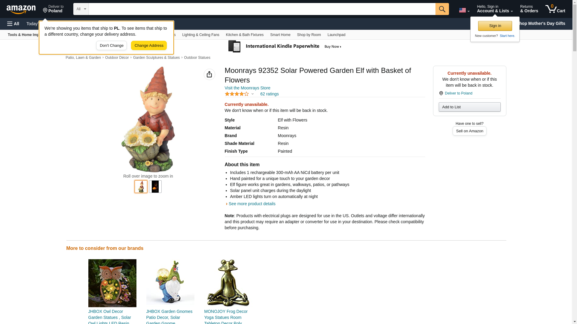 The Moonrays Outdoor Solar Powered LED Garden Elf with Basket of Flowers Statue will make your garden a place that intrigues and delights, all while taking advantage of solar energy. Made of polyresin, this hand painted whimsical garden elf is carrying a basket of sunflowers that automatically illuminate by an amber LED at night. The LED bulb will never need to be replaced and will remain cool to the touch at all times, providing safe lighting that will not burn or heat-up. Moonrays solar lights gather energy from the sun during the day, and then automatically come on at dusk to provide outdoor lighting exactly where you want it. The (1) rechargeable battery (included) charges using the sun?s rays and advanced Moonrays solar technology to provide light for 6 to 8-hours on a full battery charge. The Garden Elf Holding Flowers (#92351) and Garden Elf Watering Flowers (#92353) are also available and sold separately. This item measures 12.5 in. high. Let Moonrays help make your outdoor settings as livable, enjoyable and charming as any room in your home. The Moonrays Outdoor Solar Powered LED Garden Elf with Basket of Flowers Statue comes with a 1-year limited warranty provided to the original purchaser, which protects this product from manufacturing defects in material, assembly and workmanship.