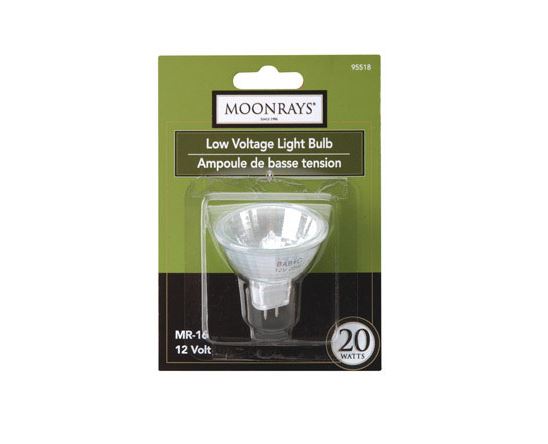 The Moonrays 20-Watt MR-16 Halogen Replacement Light Bulb is compatible with 12-volt low voltage landscape lighting. This clear 20-watt, 12-volt MR-16 halogen bulb has an average lifespan of 3,000-hours and measures just under 2 in. overall length (45-millimeters). Unlike standard bulbs, The MR-16 bulb will burn longer without sacrificing light output, display crisp white light, provide excellent beam control and offer high-lumen maintenance. For best results, make sure to replace your bulbs with the same size and style of bulb that came with your original low voltage light. The Moonrays 20-Watt MR-16 Halogen Replacement Light Bulb comes with a 1-year limited warranty provided to the original purchaser, which protects this product from manufacturing defects in material, assembly and workmanship.