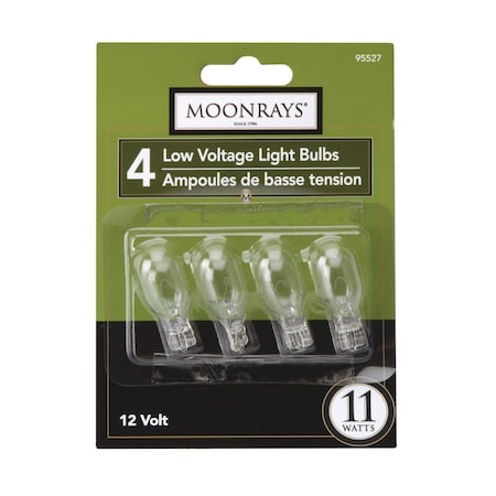 The Moonrays 11-Watt Wedge Base Replacement Light Bulb is compatible with 12-Volt Low-Voltage landscape lighting. These 11-Watt, 12-Volt bulbs have an average lifespan of 500-hours, measure 1.5 in. overall length (38 mm), are rated for 150-Lumens and come in a 4-pack. These bulbs are clear and compatible with 12-Volt Low-Voltage lights. For best results, make sure to replace your bulbs with the same size and style of bulb that came with your original light. Let Moonrays help make your outdoor settings as beautiful, livable and enjoyable as any room in your home. The Moonrays 11-Watt Wedge Base Replacement Light Bulb comes with a 1-year limited warranty provided to the original purchaser, which protects this product from manufacturing defects in material, assembly and workmanship.