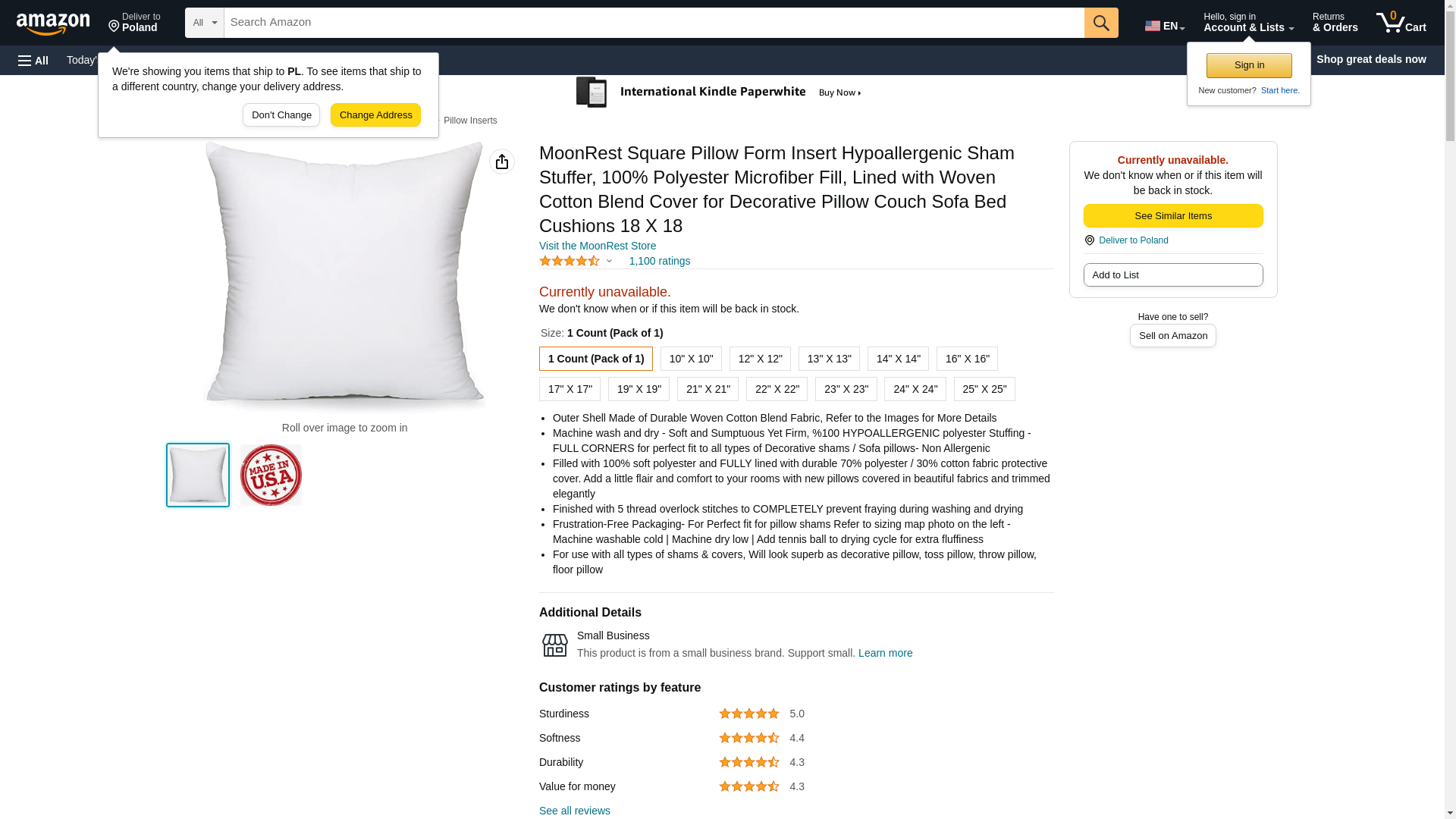 MoonRest ALL SIZES 20 X 20 New Pillow Insert Form Hypo-allergenic - Made in USA