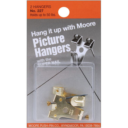 Moore Hardware for Home Decor, shop, office, repair and much more. Picture Hanger with Super Nail 50lb 2pc- This hanger is designed to keep your treasured pictures hanging even and securely. Always use correct size and follow directions. Brass plated steel hook with blue needle point tempered steel nail. The "Super Nail" easily penetrates plaster or wood, and can be re-used.