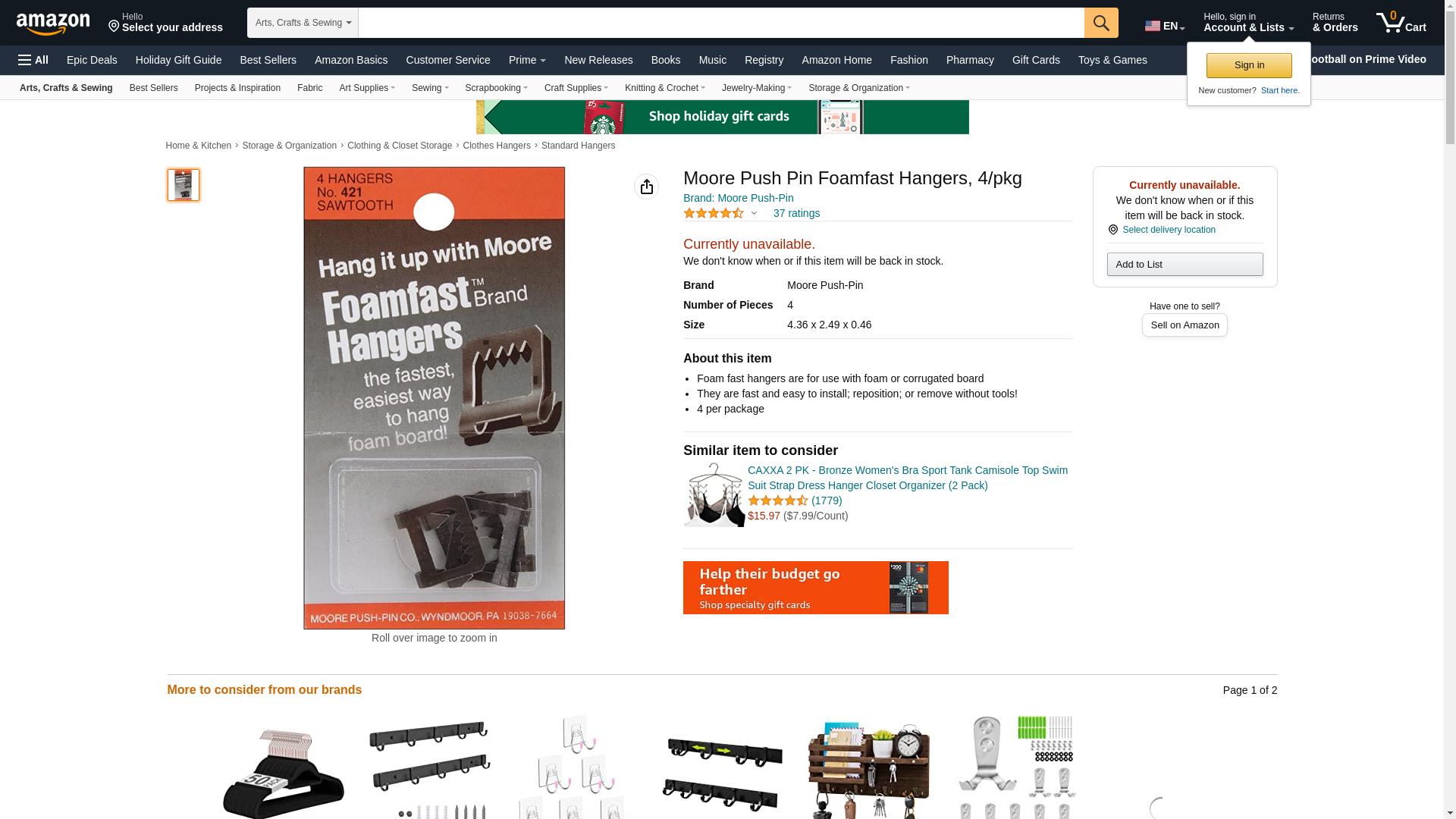 Moore Push Pin Foamfast Hangers, 4/pkg