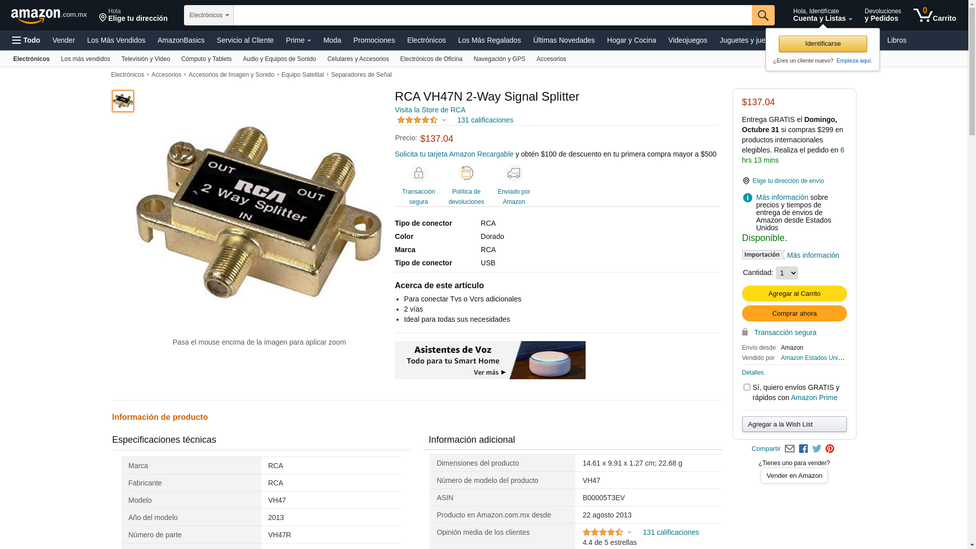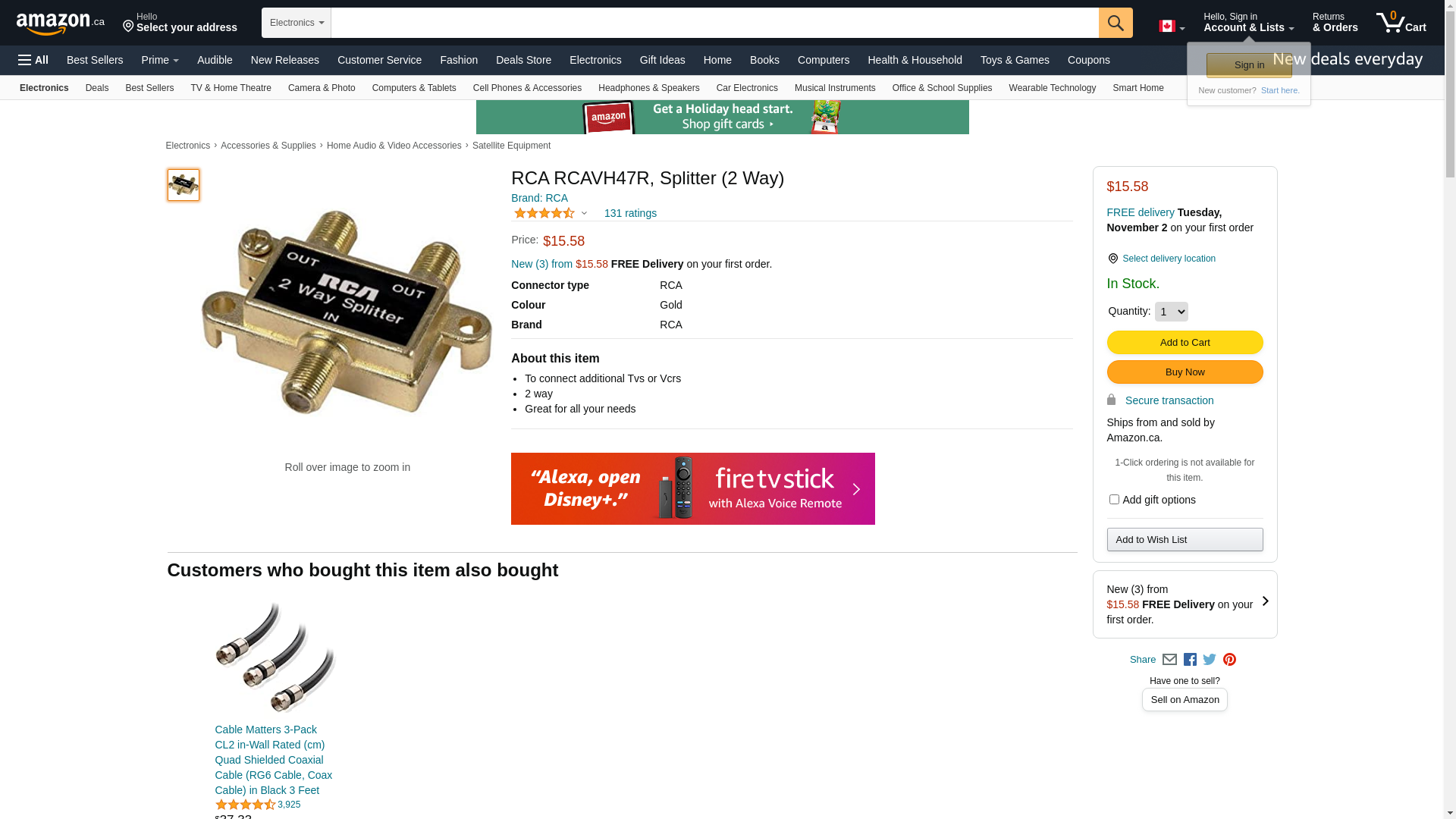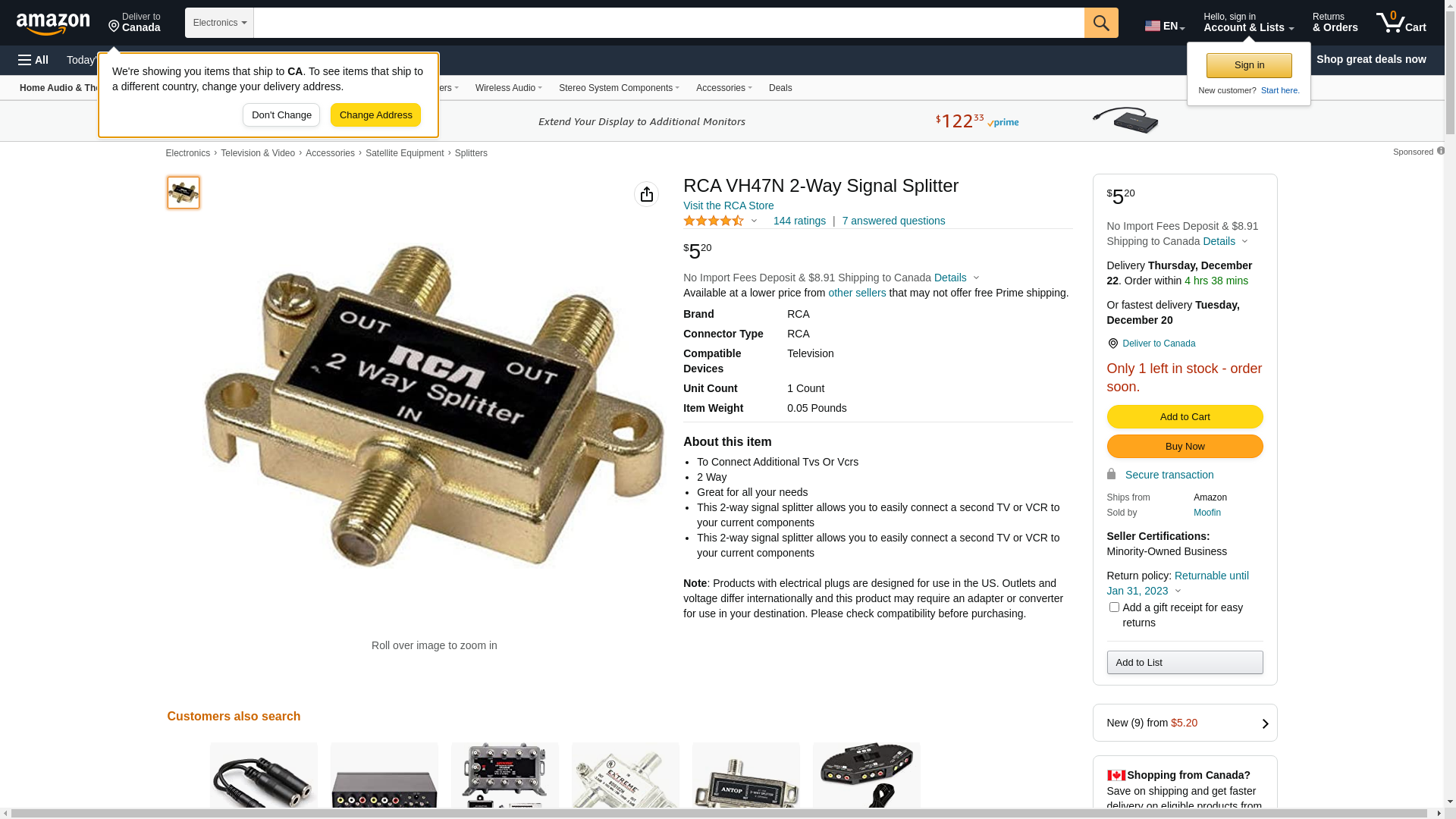 RCA VH47R Splitter (2 way)<br>To connect additional ;TVs or VCRs;2 way
