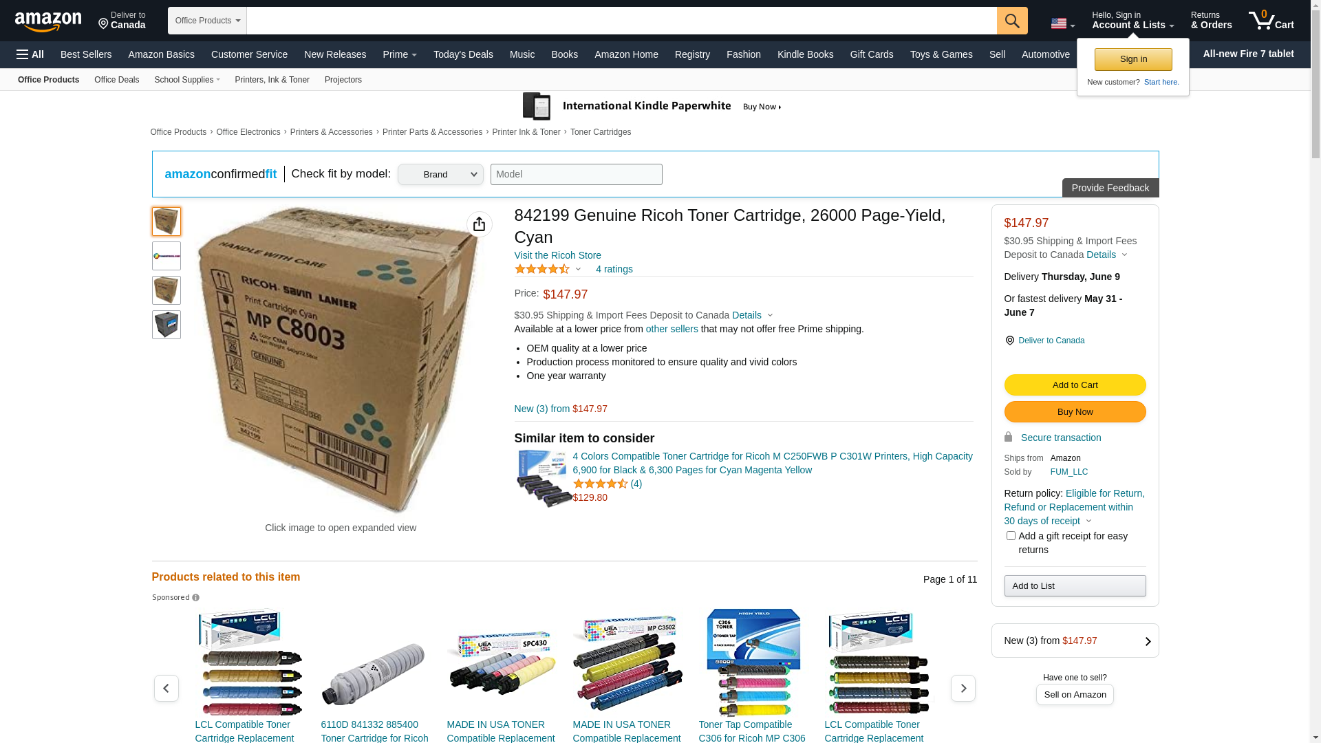842199 Genuine Ricoh Toner Cartridge, 26000 Page-Yield, Cyan