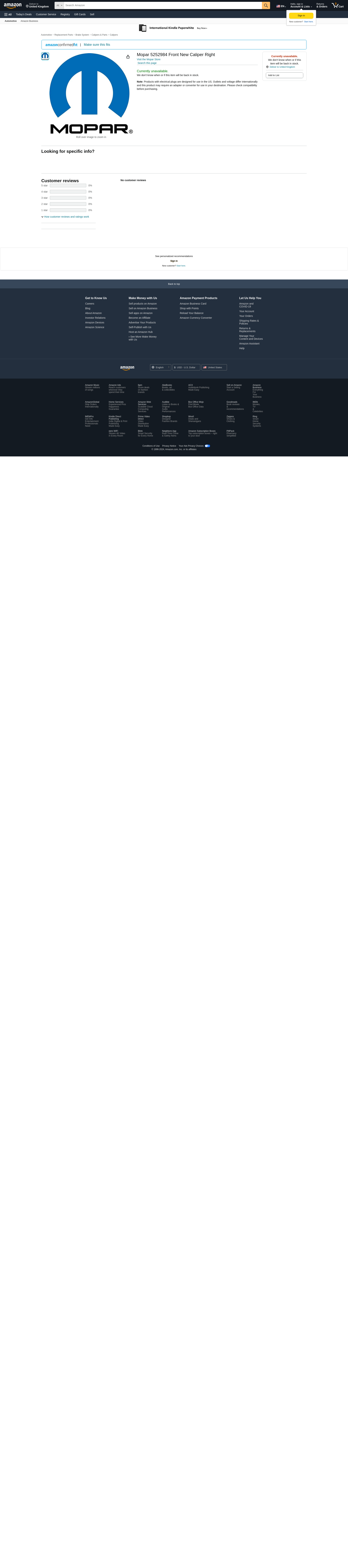 Mopar 5252984 Front New Caliper Right