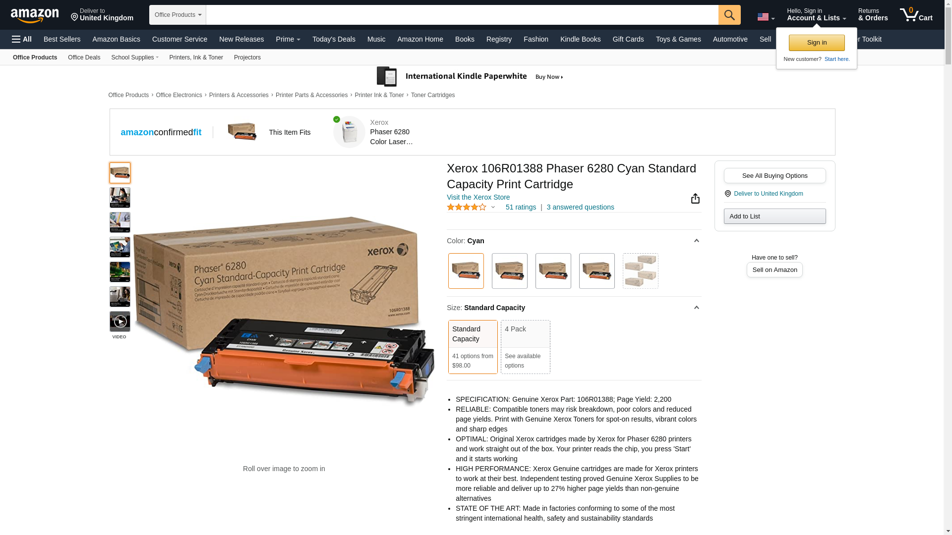 Xerox 106R01388 Phaser 6280 Cyan Standard Capacity Print Cartridge