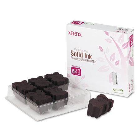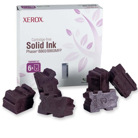 ColorStix Solid Ink Sticks produce brilliant, vibrant prints on a wide range of media with 90 percent less waste. Drop-in loading of solid ink sticks is as easy as loading a stapler. You will not have to unpack, shake, slide in, pull out and dispose of. No mess solid ink sticks are safe and clean to handle. You will also save storage space because the packages of solid ink sticks are small enough to fit into a desk drawer. Ink sticks are designed for use with Xerox Phaser 8860MFP and 8860. Each ink stick yields approximately 2,333 pages.<br/><br/><strong>Brand Name</strong>: Xerox<br/><strong>Print Color</strong>: Magenta<br/><strong>Print Technology</strong>: Solid Ink<br/><strong>Product Type</strong>: Solid Ink Stick<br/><br/><br/><b>General Information</b><br/>Brand Name: Xerox<br/>Manufacturer Part Number: 108R00747<br/>Manufacturer: Xerox Corporation<br/>Marketing Information: ColorStix Solid Ink Sticks produce brilliant, vibrant prints on a wide range of media with 90 percent less waste. Drop-in loading of solid ink sticks is as easy as loading a stapler. You will not have to unpack, shake, slide in, pull out and dispose of. No mess solid ink sticks are safe and clean to handle. You will also save storage space because the packages of solid ink sticks are small enough to fit into a desk drawer. Ink sticks are designed for use with Xerox Phaser 8860MFP and 8860. Each ink stick yields approximately 2,333 pages.<br/>Package Contents: 6 x Solid Ink Stick<br/>Product Name: Magenta Solid Ink Stick<br/>Product Type: Solid Ink Stick<br/><br/><b>Miscellaneous</b><br/>Additional Information: