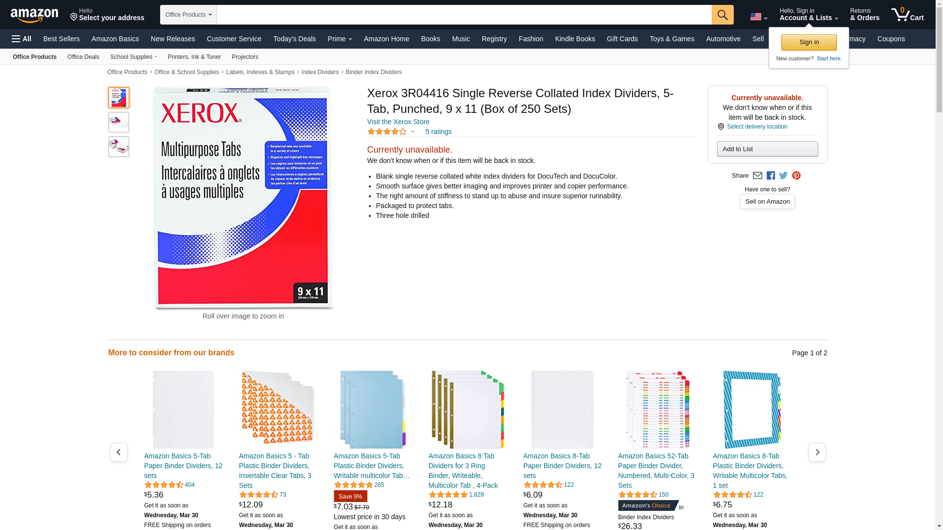Xerox 3R04416 Single Reverse Collated Index Dividers, 5-Tab, Punched, 9 x 11 (Box of 250 Sets)