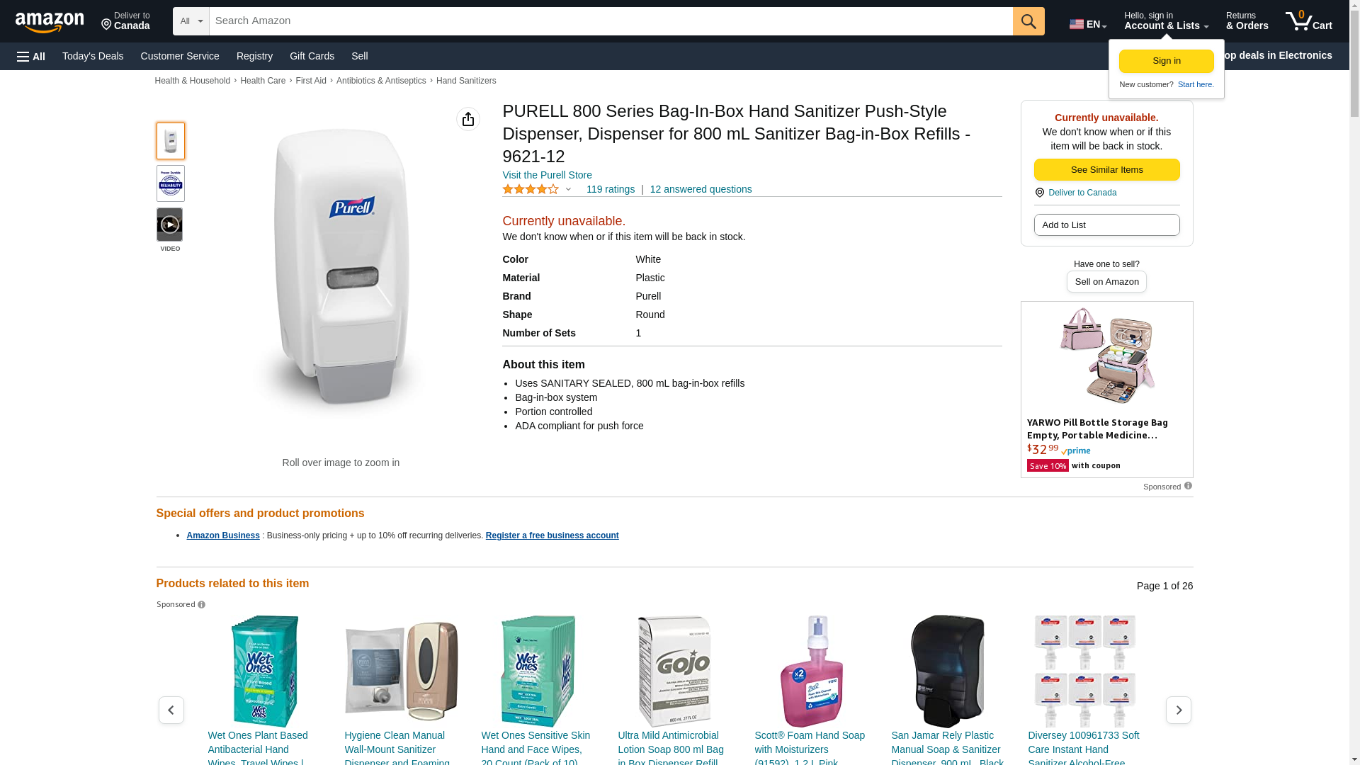 PURELL 800 Series Bag-In-Box Hand Sanitizer Push-Style Dispenser, Dispenser for 800 mL Sanitizer Bag-in-Box Refills - 9621-12