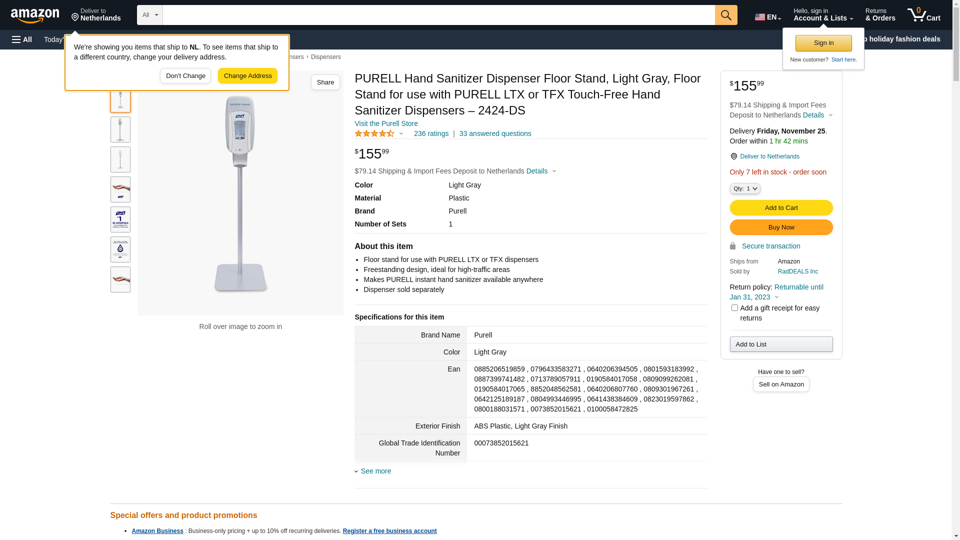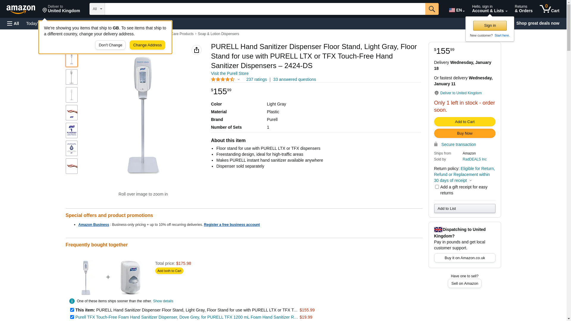 PURELL Hand Sanitizer Dispenser Floor Stand, Light Gray, Floor Stand for use with PURELL LTX or TFX Touch-Free Hand Sanitizer Dispensers – 2424-DS