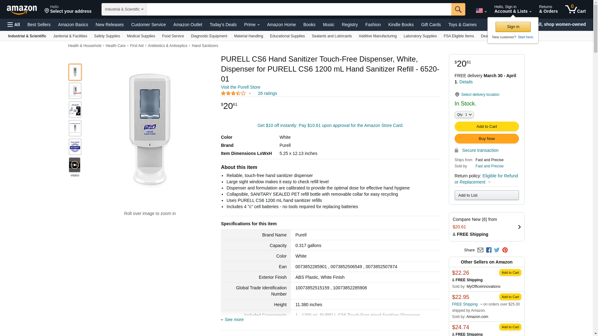 PURELL CS6 Automatic Hand Sanitizer Dispenser, White, for 1200 mL PURELL CS6 Hand Sanitizer Refills (Pack of 1) - 6520-01