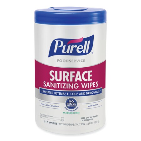 - Case includes: 6 – PURELL Foodservice Sanitizing Wipes, 110 Count Canister, 7"x 10" Wipes