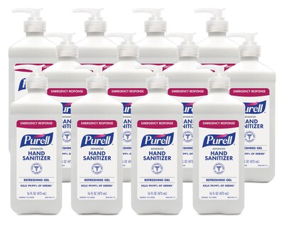 - Case Includes: 12 - PURELL Advanced Hand Sanitizer Refreshing Gel – 16 fl oz Pump Bottles. PURELL hand sanitizer kills 99.99 percent of most common germs that may cause illness; features a refreshing clean scent and evaporates quickly. This product is manufactured by a certified WBE (women owned business).