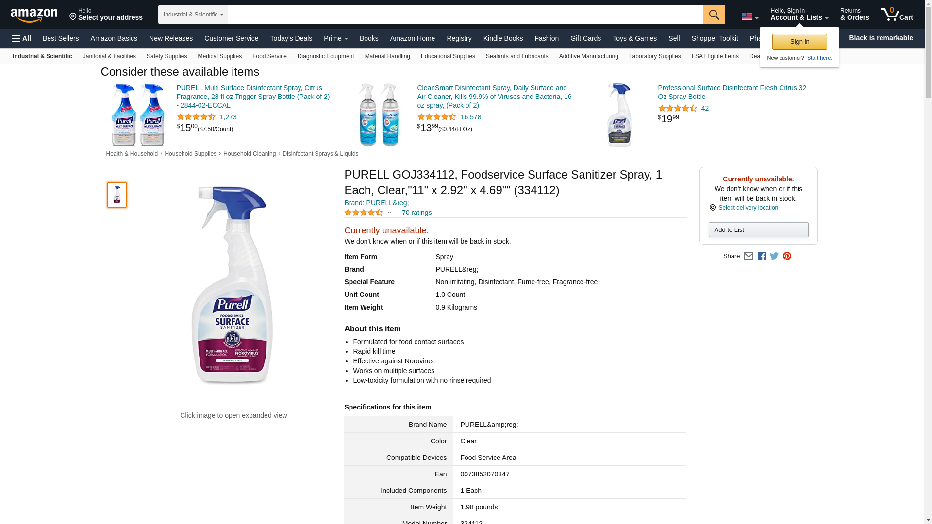 PURELL GOJ334112, Foodservice Surface Sanitizer Spray, 1 Each, Clear, 11" x 2.92" x 4.69"" (334112)