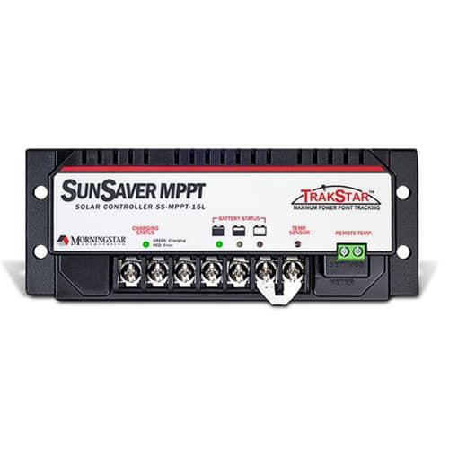 Morningstar SunSaver MPPT Charge Controller - 15A (SS-MPPT-15L) The Morningstar SunSaver MPPT Charge Controller with TrakStar Technology is an advanced maximum power point tracking (MPPT) battery charger for off-grid solar PV systems. It automatically selects 12V or 24V battery charging and allows input from larger 60-cell solar panels. It can be used with 200W of PV when charging a 12V battery and up to 400W when charging a 24V battery. The Morningstar SunSaver MPPT Charge Controller enables the use of high-voltage PV modules for off-grid 12V or 24V battery charging. Provides a means to use a 24V PV array to charge a 12V battery, reducing power losses in systems with a long cable run between the PV array and the battery. The controller has electronic protection from short circuit, overcurrent, reverse polarity, high temperature, high voltage, lightning, and transient surges. An adjustable low battery voltage load disconnect protects the battery from over-discharge. LED indicators indicate charging, low battery, and faults. Morningstar SunSaver MPPT Charge Controller - 15A (SS-MPPT-15L) Features Includes load control Maximizes energy harvest Provides power boost Use of high voltage modules Fully adjustable and programmable Extensive electronic protections Longer battery life More system information Data logging Converts 36V or 24V PV arrays Up to 4 programmable timer sequences for PV lighting applications 5-year warranty