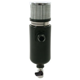 - Black polyethylene for light weight 2" Breather filter mounted on top Four sizes of inlet fittings available Can be modified for additional fitting for dual vent hoses Works with Mounting Bracket Part No. 63401 Dimensions: 3-1/8" Dia. 7. 50" tank height without Breather, 10. 50" with Breather