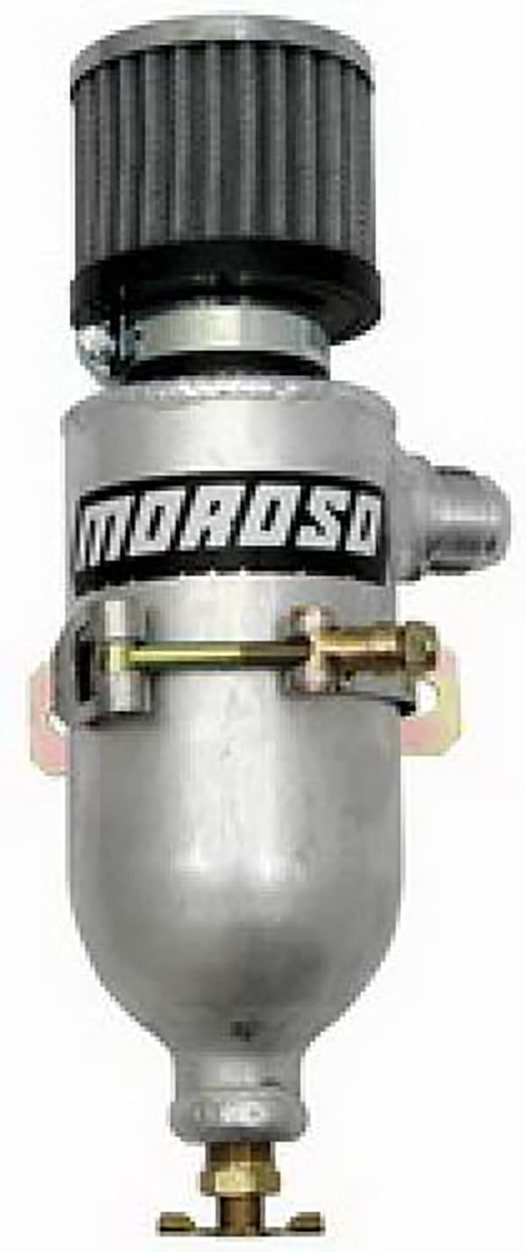 Remote breather tank is a perfect companion for Moroso's Racing Vacuum Pumps or Dry Sump Tanks has -16AN fitting to simplify plumbing. All aluminum, lightweight tank features mounting straps to simplify installation. Includes non-hooded, clamp-on style Filtered Breather that traps oil while allowing air to escape freely. Petcock facilitates tank draining. 3.125" overall diameter. 6.50" tank height. 11.50" overall height.