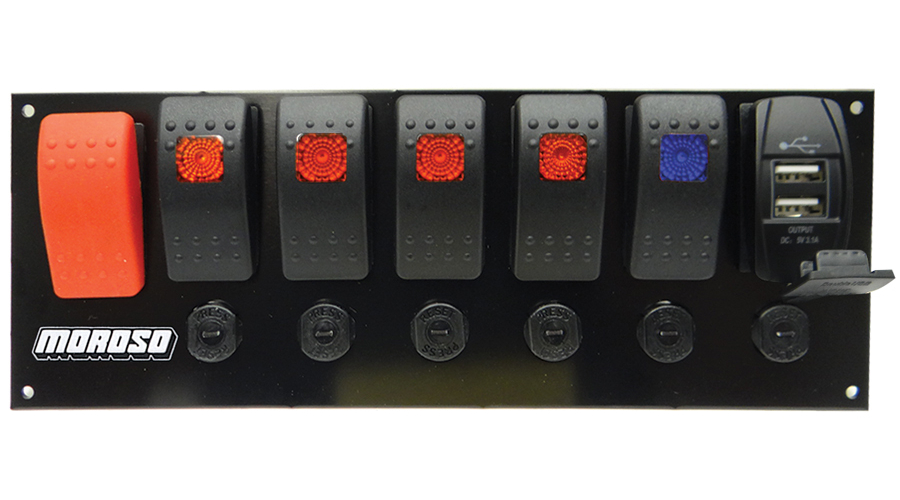 Moroso Performance Products Switch Panel - Dash Mount - 9-1/8 x 3-3/8 in - 5 Toggles / 1 Momentary Toggle / 1 Dual USB Port - 20 amp Breakers - Lighted - Aluminum 74194