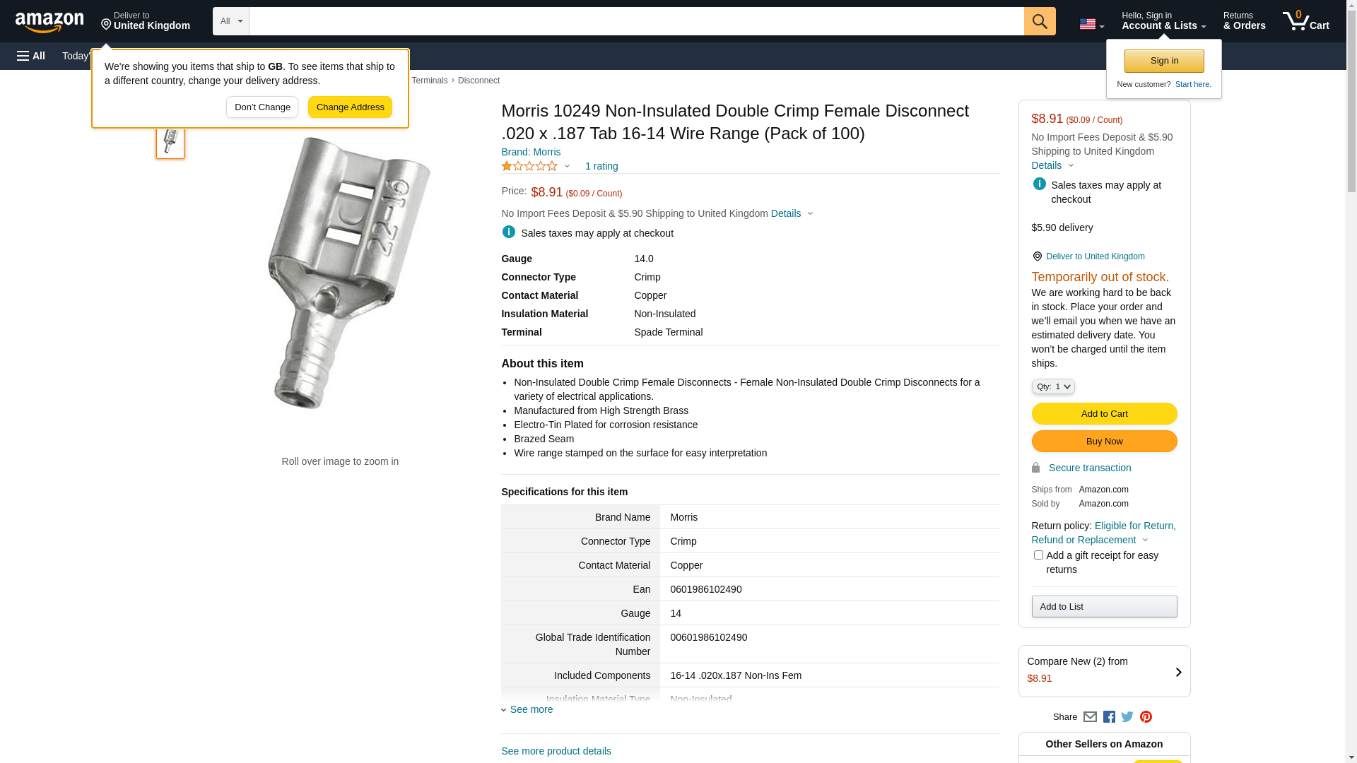 Morris 10249 Non-Insulated Double Crimp Female Disconnect .020 x .187 Tab 16-14 Wire Range, 100-Pack
