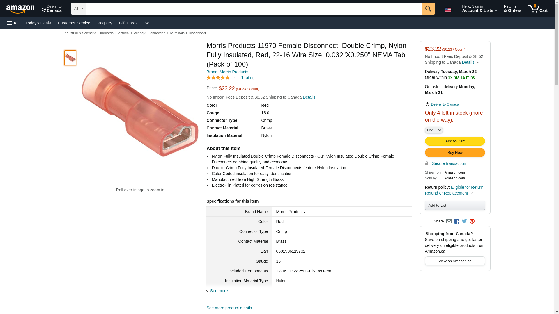 Morris Products 11970 Female Disconnect, Double Crimp, Nylon Fully Insulated, Red, 22-16 Wire Size, 0.032X0.250 NEMA Tab (Pack of 100) (2)