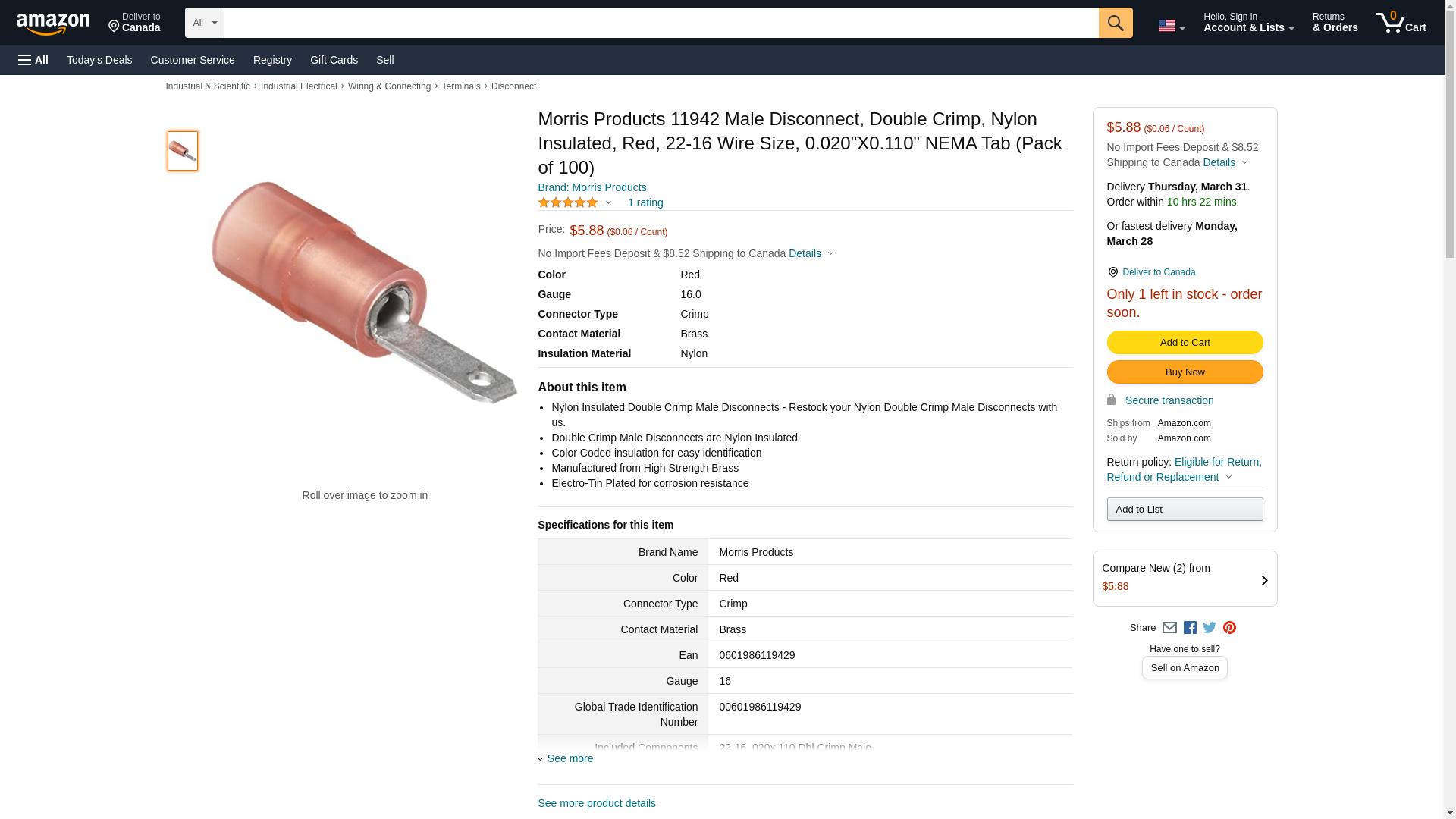 Morris Products 11942 Male Disconnect, Double Crimp, Nylon Insulated, Red, 22-16 Wire Size, 0.020"X0.110" NEMA Tab, 500-Pack
