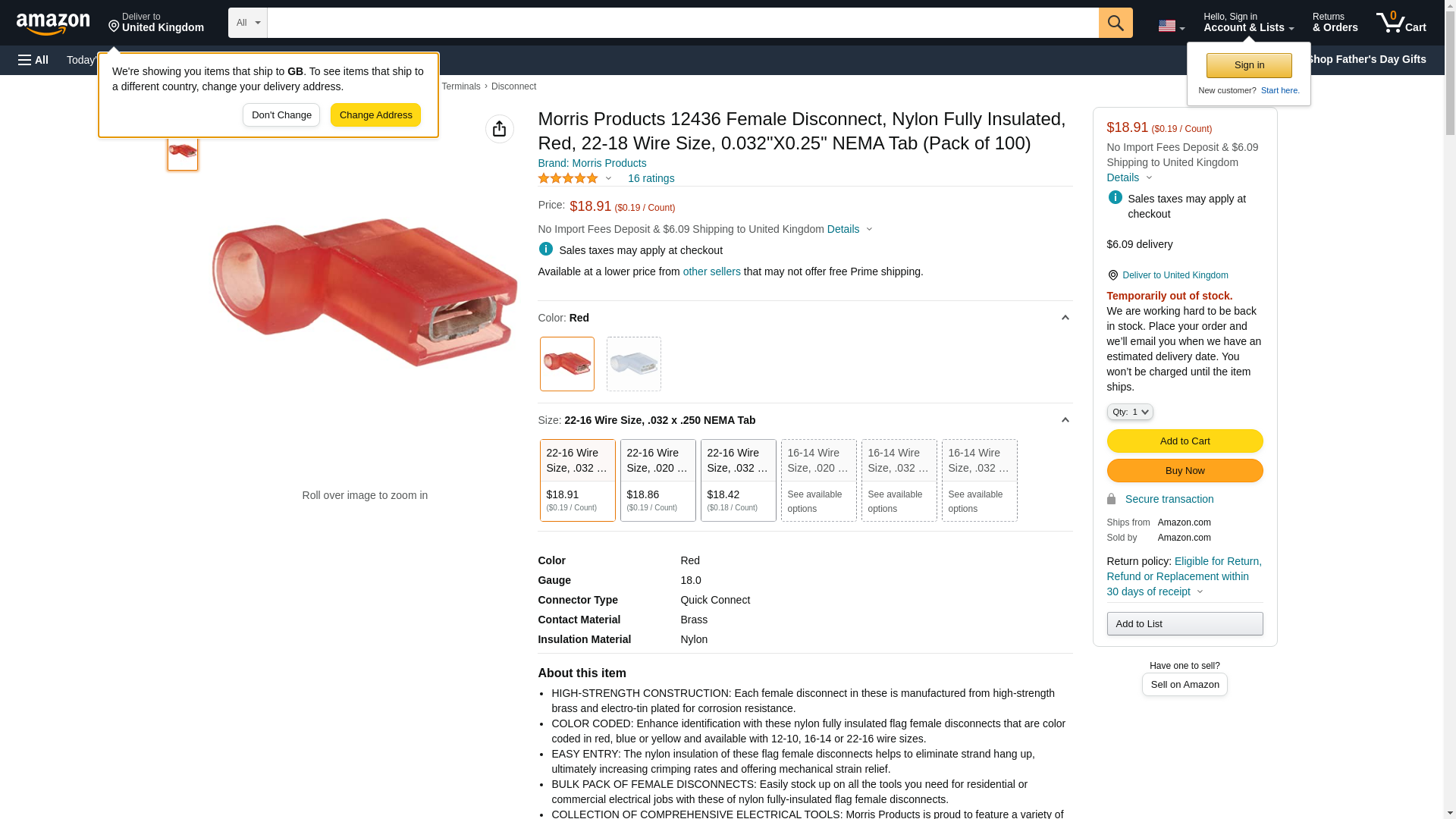 Morris Products 12436 Female Disconnect, Nylon Fully Insulated, Red, 22-18 Wire Size, 0.032X0.25 NEMA Tab (Pack of 100) (2)