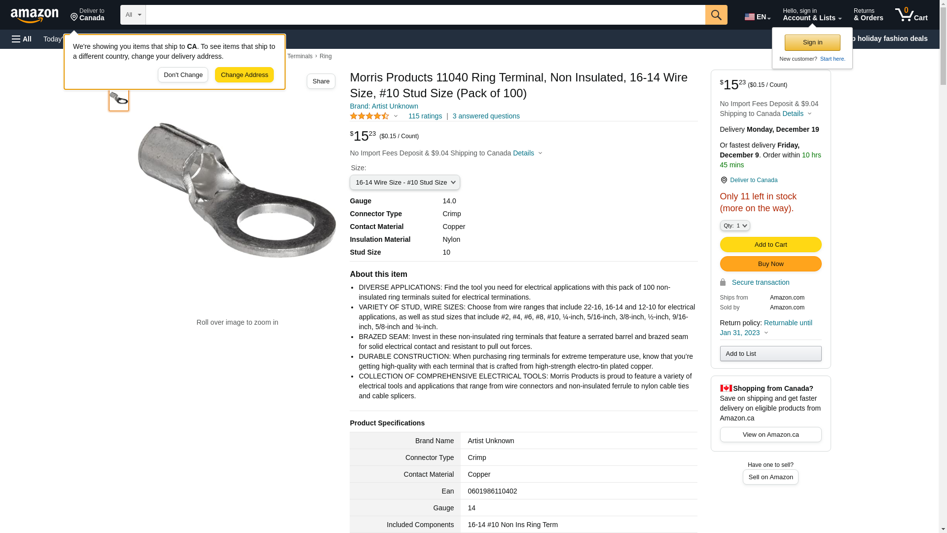 Morris Products 11040 Ring Terminal, Non Insulated, 16-14 Wire Size, #10 Stud Size (Pack of 100)