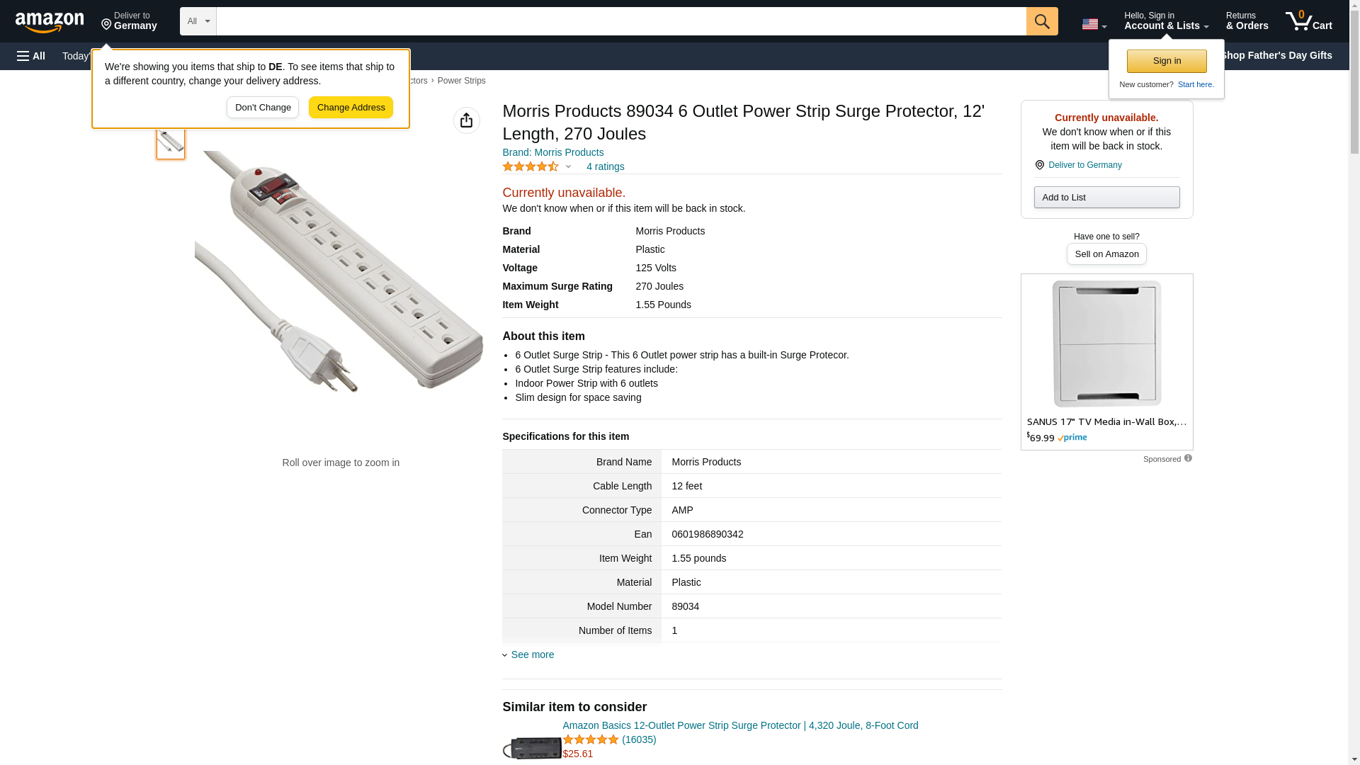 Morris Products 89034 6 Outlet Power Strip Surge Protector, 12' Length, 270 Joules