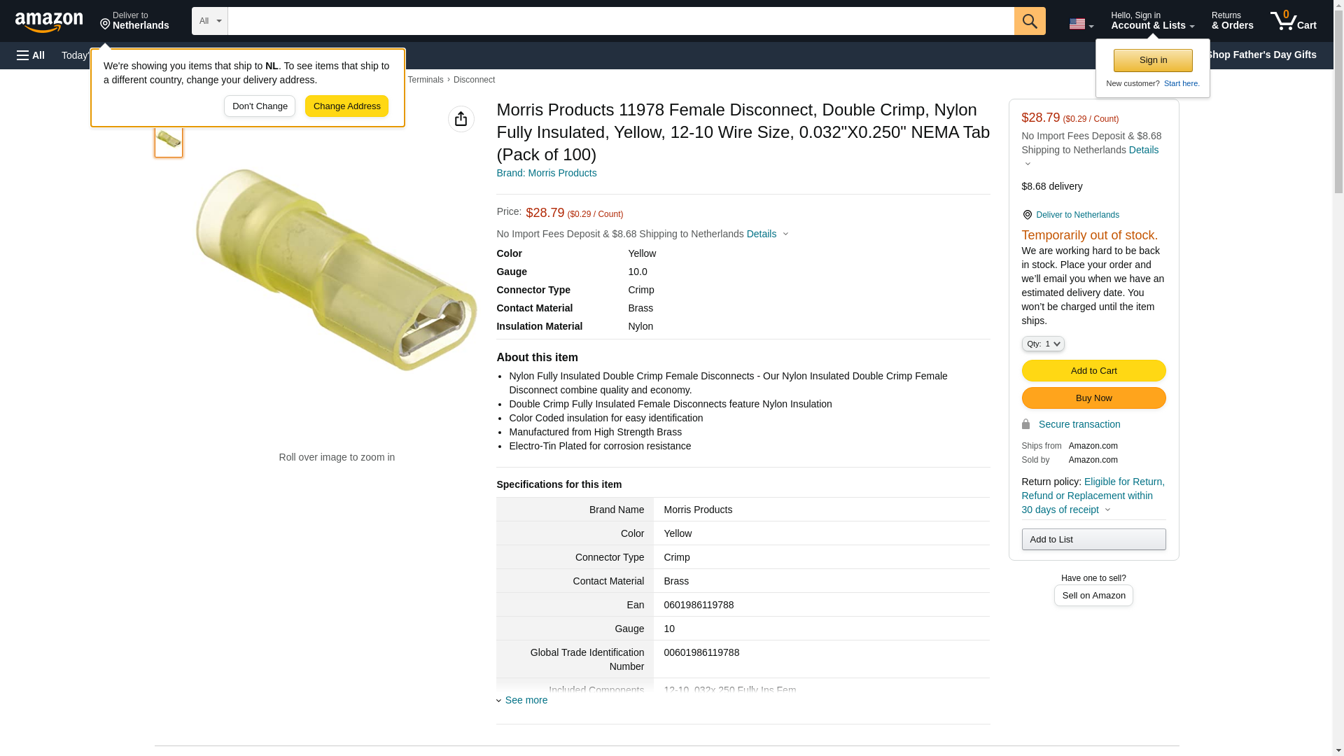 Morris Products 11978 Female Disconnect, Double Crimp, Nylon Fully Insulated, Yellow, 12-10 Wire Size, 0.032X0.250 NEMA Tab (Pack of 100) (2)