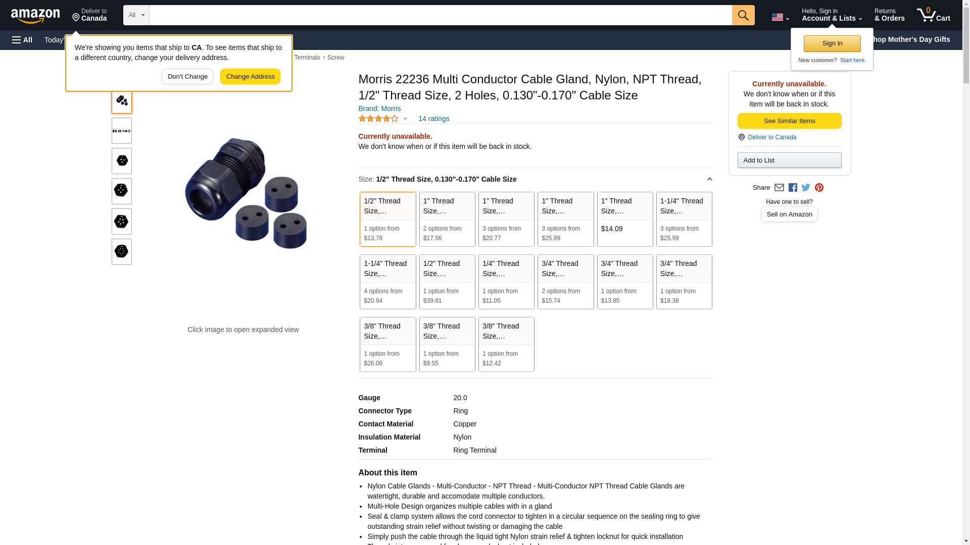 Morris 22236 Multi Conductor Cable Gland, Nylon, NPT Thread, 1/2" Thread Size, 2 Holes, 0.130"-0.170" Cable Size. Nyl...