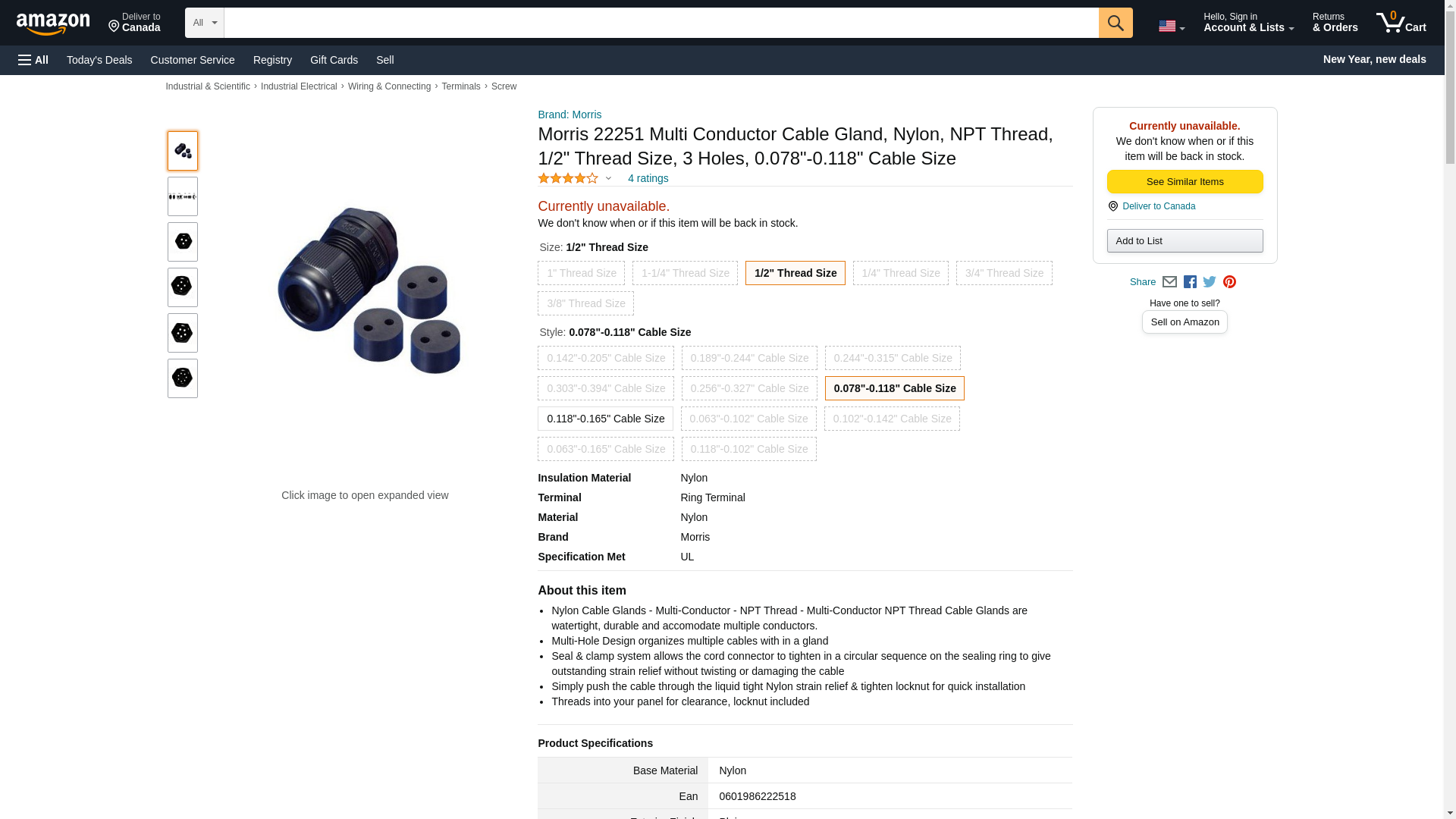 Morris 22253 Multi Conductor Cable Gland, Nylon, NPT Thread, 1/2" Thread Size, 3 Holes, 0.138"-0.205" Cable Size. Nyl...