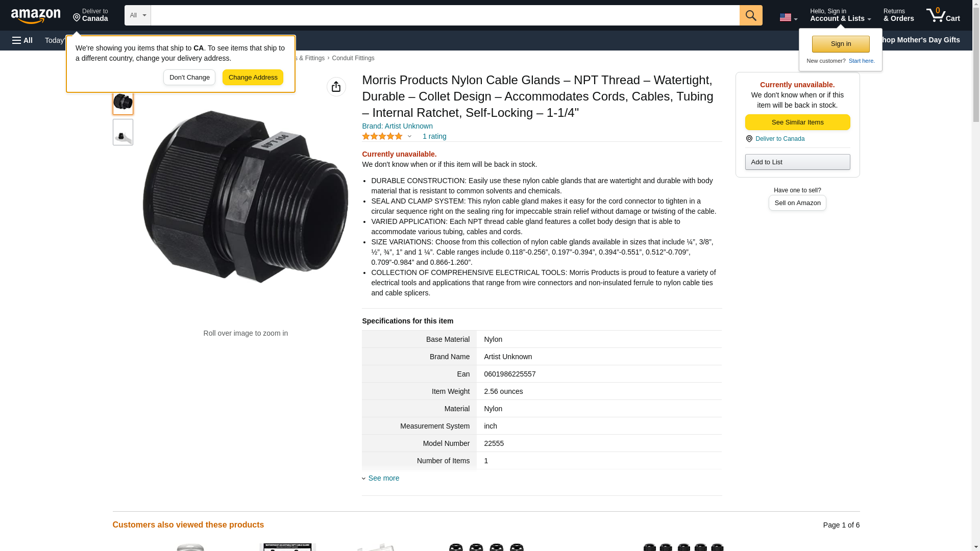 Morris 22555 Cable Gland, NPT Thread, Nylon, 1-1/4" Thread Size, 0.866"-1.260" Cable Size. Nylon Cable Glands NPT Thr...