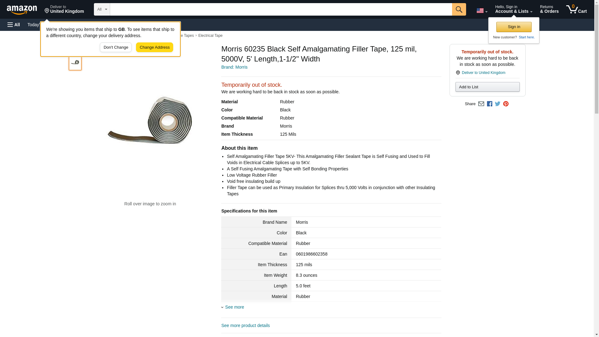 Morris 60235 Black Self Amalgamating Filler Tape, 125 mil, 5000V, 5' Length,1-1/2" Width