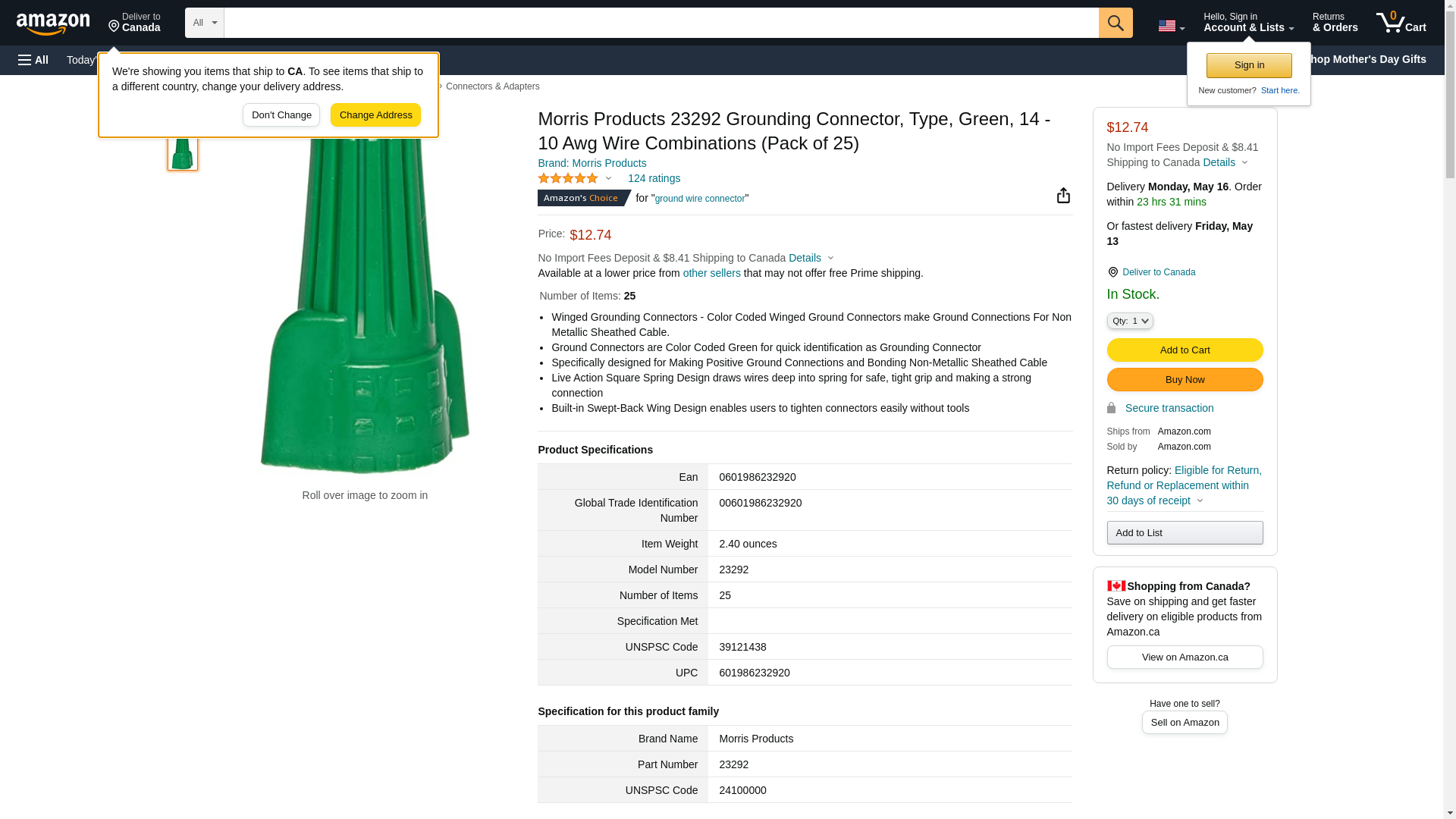 23292 Features: -Grounding connectors. -Specifically designed for making positive ground connections and bonding non-metallic sheathed cable. -Live action square spring draws wires deep into spring for safe, tight grip and making a strong connection. -Built-in swept-back designed wing enables users to tighten connectors easily without tools. -No minimum order. -UL / CSA listed. Product Type: -Connectors. Generic Specifications: -Wire combinations: No.14 thru 10 AWG. Dimensions: Overall Height - Top to Bottom: -1.134". Overall Width - Side to Side: -0.795". Overall Product Weight: -0.21 lbs.