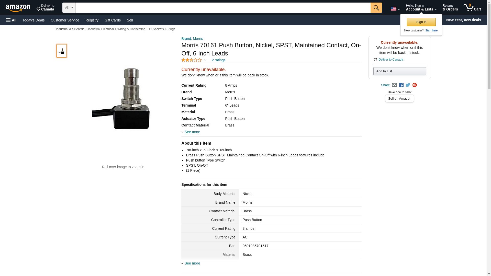 Morris 70161 Push Button, Nickel, SPST, Maintained Contact, On-Off, 6-inch Leads