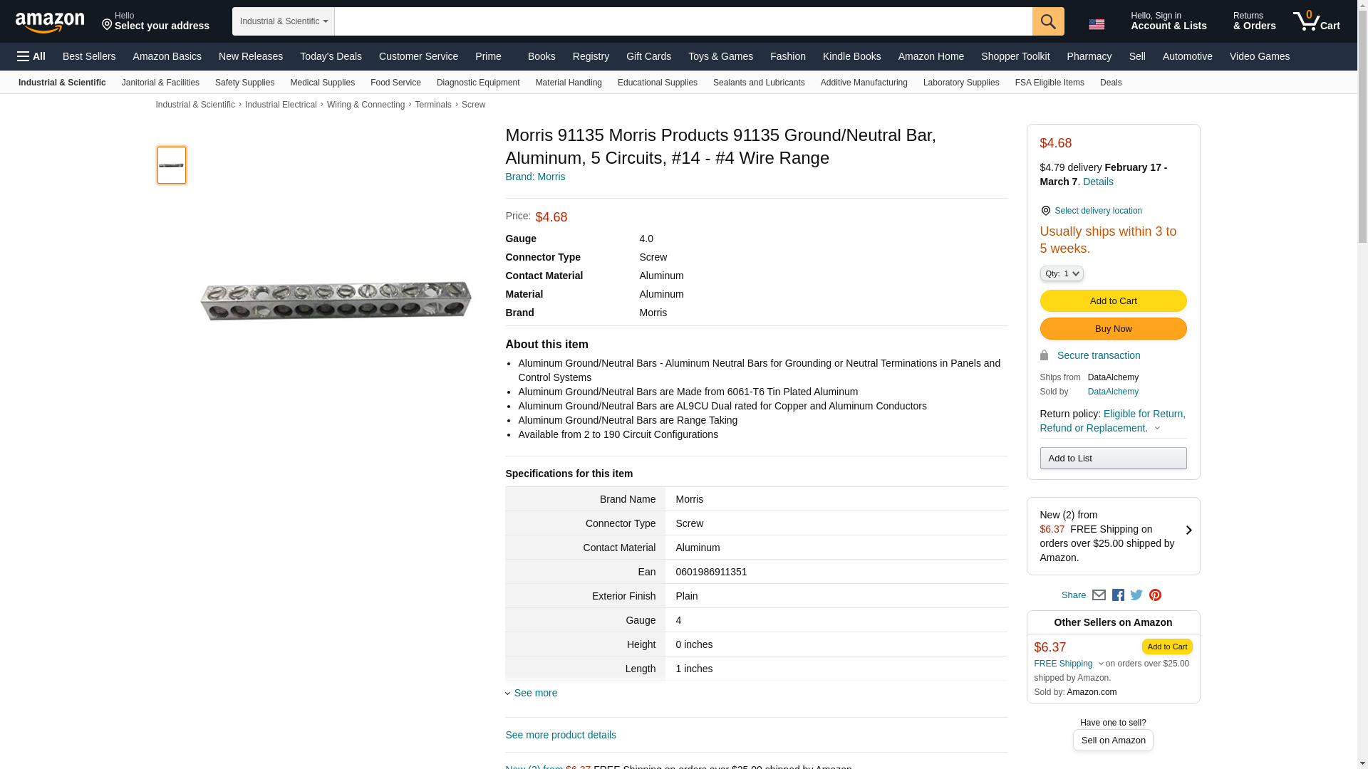 Morris #4 to #14 AWG 5 Circuit Aluminum Ground/Neutral Bar 91135. ✅Morris authorized distributor ✅. ☎ (800) 884-5767 Mon-Fri 8:00 AM - 5:00 PM ET or order online 24/7