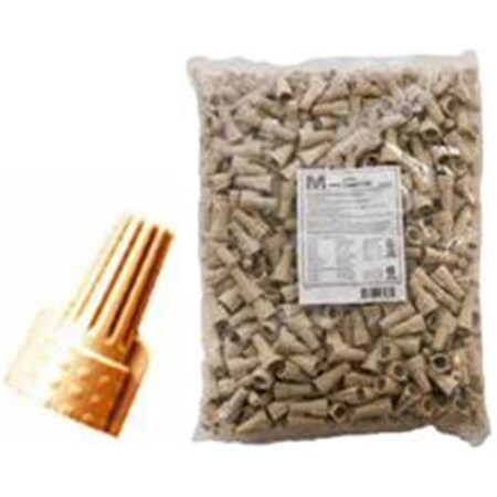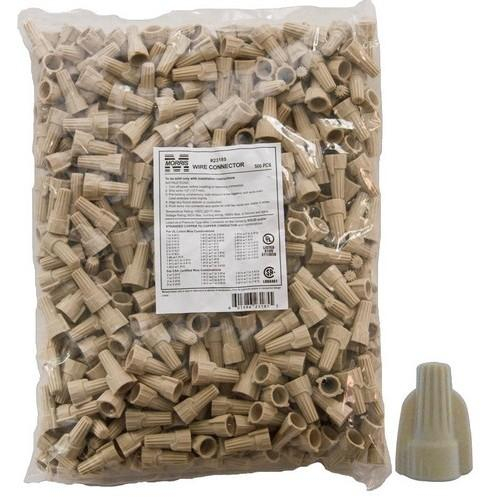 Twisted Wing Connectors Tan Bagged 500 Bulk Pack - Color Coded Wire Connectors make connecting wires simple and easy.Features. Color coded wire connectors for easy identification.. Swept wing fits into your hand naturally to give extra torque leverage and reduce the effort required for connecting even large wire combinations yet compact with narrow profile to take up less space in junction boxes.. Ribbed cap on color coded wire connectors provide more secure grip and faster fingertip starts even when hands become slippery.. Temperature rated at 221F 105C maximum.. No pre-twisting of conductors is required - spring creates its own thread.. Reusable connector threads on or off splice for fast and easy circuit changes and additions.. Tough UL 94V-2 Flame retardant shell will not crack or break even when applied to maximum wire combinations under extreme pressure.. 600V 1000V fixtures signs.Specifications. Packaging - Bagged Bulk Pack.. Color - Tan.. Wire Combinations - No.22 Thru 8 Awg.. Pack of 500.. Item Weight - 3.15 lbs.. NM - Twisted Wing Connectors.. Master Section - 3 Wire Management.