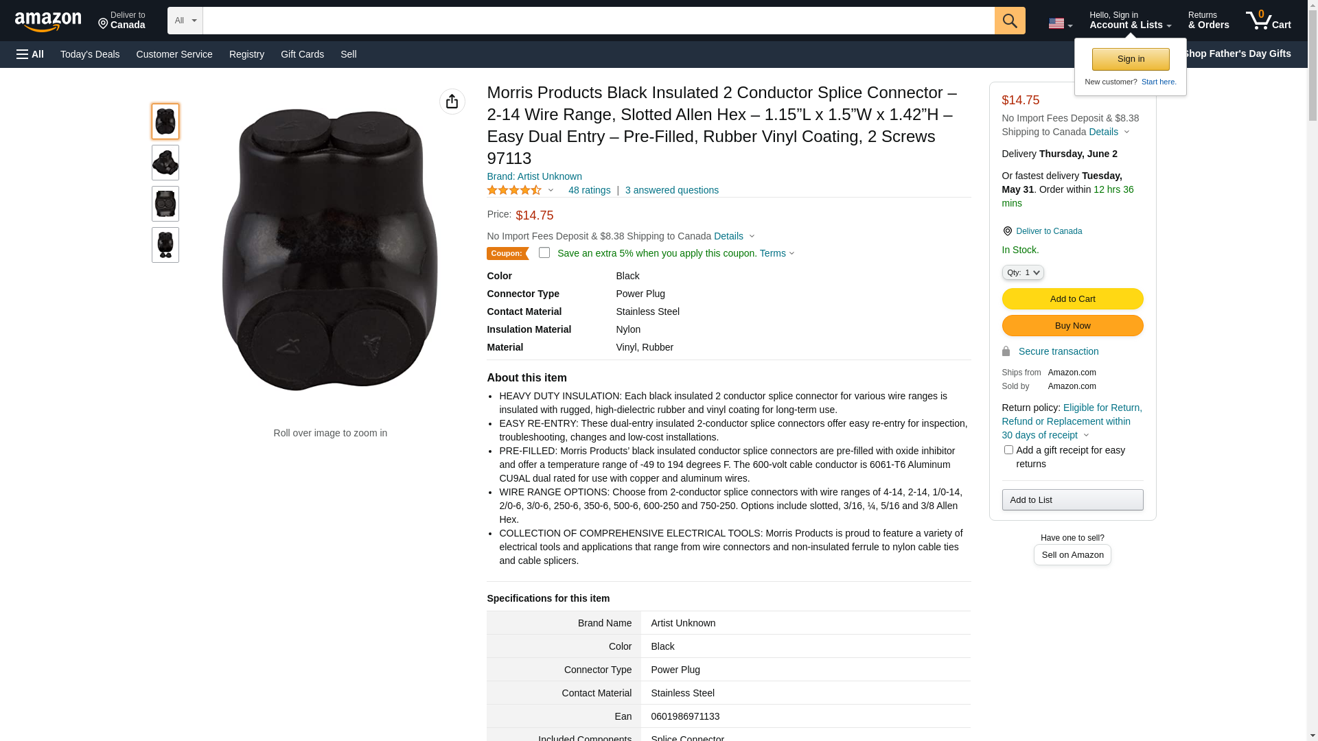 Morris Products Black Insulated 2 Conductor Splice ConnectorSimplify cable splicing with this black insulated 2-conductor connector from Morris Products. The dual entry features optional wire entry from either side of the connector and insulation made from rugged high-dielectric rubber and vinyl coating. Each conductor splice connector is pre-filled with oxide inhibitor and plugs are marked with connector max wire size for simplified identification.Each 600-volt electrical power conductor splice connector offers one wire per terminal and is 6061-T6 Aluminum CU9AL Dual Rated for use with aluminum and copper wires. Find easy re-entry for inspection, changes and troubleshooting with this must-have for your electrician’s tool box. Offering a temperature range of -49 to 194 degrees Fahrenheit, this black insulated connector is ANSI C119.4 and cULus 486b listed. Choose from 2-conductor splice connectors with wire ranges of 4-14, 2-14, 1/0-14, 2/0-6, 3/0-6, 250-6, 350-6, 500-6, 600-250 and 750-250. Options include slotted, 3/16, ¼, 5/16 and 3/8 Allen Hex.Morris Products is a premium manufacturer of lighting and electrical products that include meters and testers, organizational devices, power connectors and tools. Established in 1994, Morris Products is headquartered in Queensboro, New York.Features:- Dual Entry- Black, Insulated Electrical Power 2-Conductor Splice Connector- Temperature Range: -49 to 194 Degrees F- ANSI C119.4 and cULus Listed Through 750MCM- 600 Volt- Pre-Filled with Oxide Inhibitor- High-Dielectric Rubber/Vinyl CoatingPackage Includes:- 1 x Black Insulated 2-Conductor Splice ConnectorScroll up click'ADD TO CART'to get yours