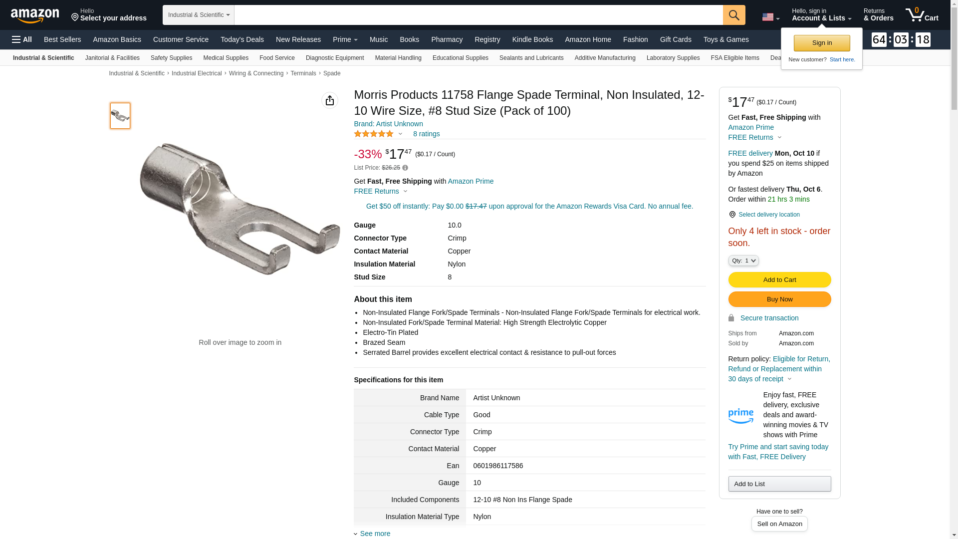 Morris Products 11758 Flange Spade Terminal, Non Insulated, 12-10 Wire Size, #8 Stud Size (Pack of 100)