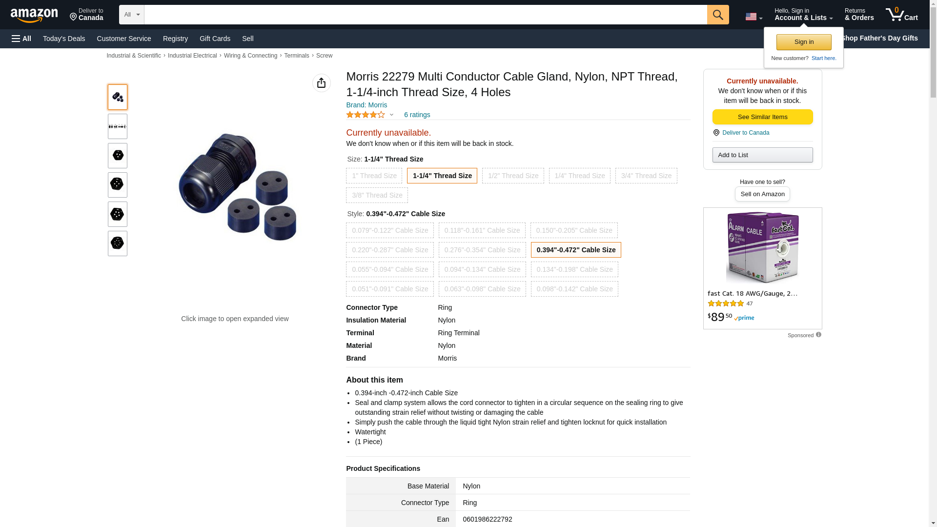 Morris 22279 Multi Conductor Cable Gland, Nylon, NPT Thread, 1-1/4" Thread Size, 4 Holes, 0.394"-0.472" Cable Size. N...