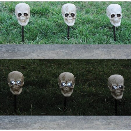 Light-up your pathway with a set of three plastic skulls with ground stakes attached to each. Bright white LED light-up eyes fade in and out and one of four different eerie sound tracks play at each activation. Try me and sound activation included. Requires 3 AA batteries. Skulls measures 6.5 inches x 4 inches x 6 inches. Skulls can be displayed a distance of two feet apart.