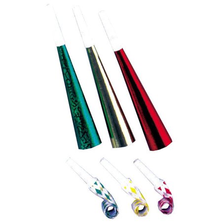 Fringed trumpets, 9'' plastic tipped foil horns and 1 8'' party blowouts. Box of 100 only. Great for New Year's Eve parties!... Country of Origin: USA. (Category: Decorations & Props - Decorations - Holiday Specialties)