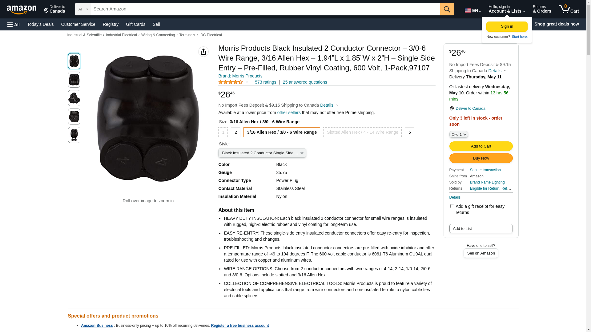 <p><strong>Morris Products Black Insulated 2 Conductor Connector</strong></p> <p>3/0-#6 Black Insulated 2-Conductor Side Entry Splice Features: Both Wires Enter Same Side of insulated connector Insulated Connector is 6061-T6 Aluminum CU9AL Dual Rated for use with Copper and/or Aluminum wires Insulated with rugged high-dielectric rubber/vinyl coating Pre-filled with oxide inhibitor Easy re-entry for changes, inspection or troubleshooting Plugs marked with connector max wire size for easy identification Temperature range of -49 degree F to 194 degree F (-45 degree to 90 degree C) ANSI C119.4 and cULus 486b Listed Rated for use with 194 degree F(90 degree C) Cables 600 Volt One wire per terminal</p> <p><strong>Features:</strong></p> <p>Both Wires Enter Same Side of insulated connector<br />Insulated Connector is 6061-T6 Aluminum CU9AL Dual Rated for use with Copper and/or Aluminum wires<br />Insulated with rugged high-dielectric rubber/vinyl coating<br />Pre-filled with oxide inhibitor<br />Easy re-entry for changes, inspection or troubleshooting<<br />Plugs marked with connector max wire size for easy identification<<br />Temperature range of –49°F to 194°F (–45° to 90°C)<br />ANSI C119.4 & cULus 486b Listed<<br />Rated for use with 194°F(90°C) Cables<br />600 Volt<br />One wire per terminal<<br />Dimension Measurements 1.94 x 1.85 x 2.00 Inches</p> <p><strong>Package Includes:</strong><br />3 of Black Insulated 2-Conductor Connector</p>