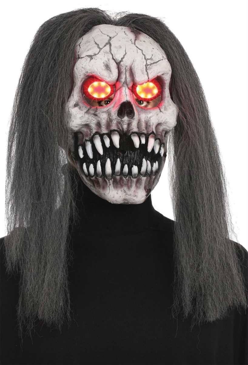 - On Halloween the dead will rise, with evil beaming from their eyes! This seriously creepy skull mask features demonic light-up eyes, a large sharp-toothed grin and long scraggly gray hair. Requires 3 AG13/LR44 batteries, not included. One size fits most.